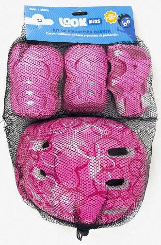 CASCO INFANTIL C/AJUSTADOR RODILLERAS, GUANTES Y CODERAS ROSA LOOK.